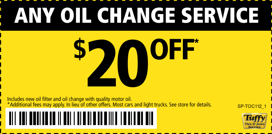 Good only atTuffy West Jefferson Blvd. Schedule Service Print coupon Share to Google Share to Facebook Offer details $20 OFF ANY Oil Change * See coupon for exclusions. Email Coupon First name * Last name * Email address * Sign me up to receive future offers via text from Tuffy Fort Wayne (W. Jefferson Blvd.): Via Text Cell/Mobile Phone By clicking "I accept" below, I expressly agree to receive marketing text messages made by or on behalf of Tuffy Fort Wayne (W. Jefferson Blvd.) to the telephone number(s) I’ve listed above. I understand that I may receive such text messages by the use of Automatic Telephone Dialing Systems (including “Predictive Dialers” or “Autodialers”) and I agree to receive them even if I have registered my number(s) with my state or federal Do-Not-Call list(s). I understand that such text messages will include advertising containing offers for goods or services and that I may revoke this consent at any time by telephone, return text message or by Visiting tuffywestjefferson.com/stop to unsubscribe. Message and data rates may apply. I also understand that I am NOT required to provide this consent as a condition of purchasing goods or services. I accept View: Text Specials Terms and Conditions with this link.